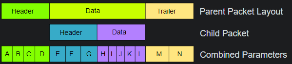 The illustration shows a parent "Packet" consisting of a header, data and trailer zones. within the data zone of the parent is a child packet consisting of just a header and data. The final row shows the combined layout of the parent with the child paremeters inline.