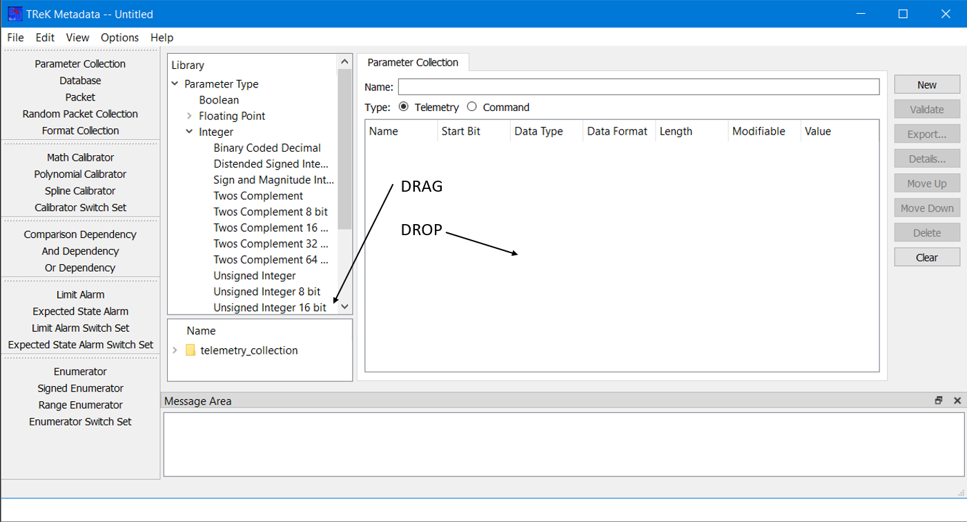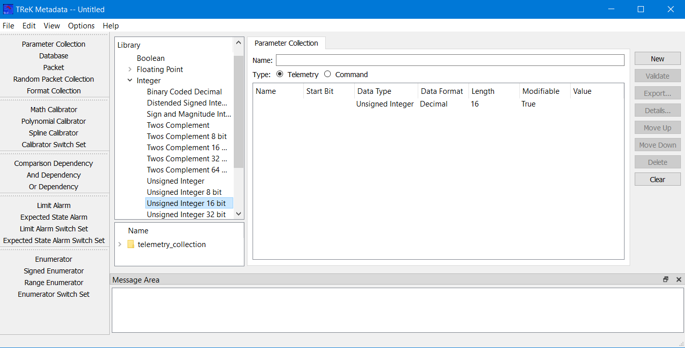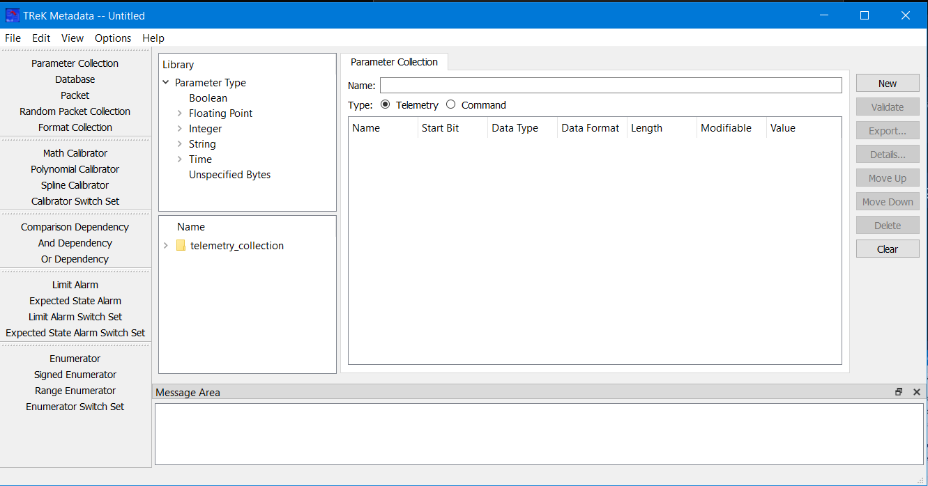 On the left-hand side of the Main Window you will see the Library Area. It is configured to provide access to items you can use to create a Parameter Collection. The Parameter Type list provides a list of all the parameter types that can be added to a Parameter Collection. The lower half of the library area shows the Telemetry Collection or Command Collection list. It is configured to provide access to existing Parameter Collections stored in the trek_workspace. When you create a Parameter Collection and export it to the trek_workspace, it will automatically be added to the Parameter Collection list. The Library Area only displays items stored in the trek_workspace. If you need to work on an item that is outside of the trek_workspace, you will need to move it into the trek_workspace. In the middle of the Main Window you will see the Work Area showing the Parameter Collection Tab. This is where you will define the details of your Parameter Collection. On the right-hand side of the Main Window you will see a set of buttons that provide various capabilities applicable to the Parameter Collection you are working on (e.g., Validate to validate the Parameter Collection or Export to export the Parameter Collection).