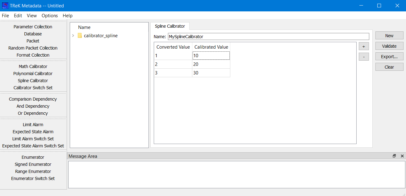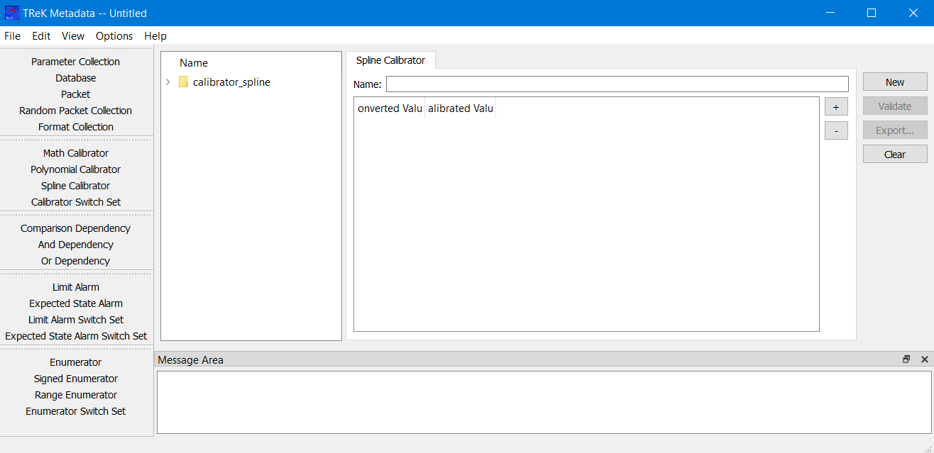 On the left-hand side of the Main Window you will see the Library Area. It is configured to provide access to existing Spline Calibrators in the trek_workspace. When you create a Spline Calibrator and export it to the trek_workspace, it will be added to the Spline Calibrator list. The Library Area only displays items stored in the trek_workspace. If you need to work on an item that is outside of the trek_workspace, you will need to move it into the trek_workspace. In the middle of the Main Window you will see the Work Area showing the Spline Calibrator Tab. This is where you will define the details of the Spline Calibrator. On the right-hand side of the Main Window you will see a set of buttons that provide various capabilities applicable to the Spline Calibrator you are working on (e.g., Validate to validate the Spline Calibrator or Export to export the Spline Calibrator).