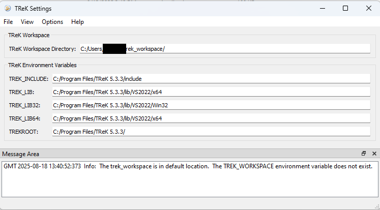 TReK Environment Variables The TReK Environment Variables area displays information about TReK environment variables. The environment variables listed will differ on Windows and Linux.